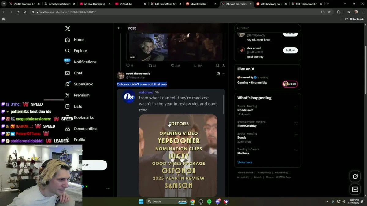 Ostonox responded to accusations on his stream. He’s a prominent editor who works regularly with Hasan Piker and was brought in to edit packages for the awards. He claimed he didn’t intentionally remove xQc and suggested the packages followed nomination chains or “good vibes” criteria that naturally excluded certain streamers.