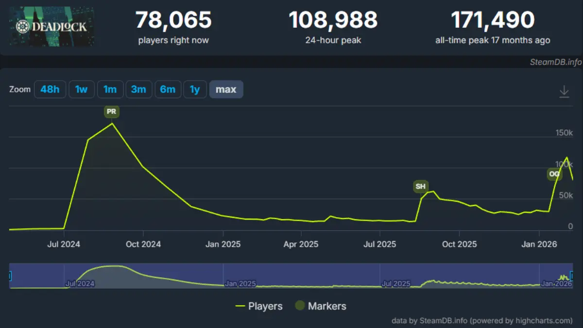 According to the charts on SteamDB, Deadlock has reached a peak of over 171,490 concurrent players, trending upwards. As more people gain access to the private alpha, the number of players is expected to climb further.